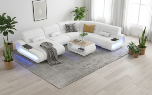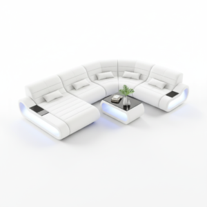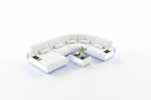 The Catina Leather Curve Shape Sectional is available in 10 different colors of genuine or bonded leather. Configure to fit your own style and specifications – L-shaped, left or right hand facing. This couch features storage space at both ends of the sectional, perfect for books or decorative items. These storage spaces are illuminated by a LED light. It can be optionally upgraded to multi-color lights that can be controlled by a wireless remote. This modern leather sectional is sleek yet contemporary. This simple design will accent other pieces in the room and tie it together beautifully. To complete the look of your living space we recommend adding the armless chair and coffee table. Cup holders and USB ports are recommended for larger families to optimize maximum enjoyment. An additional bed function makes a great movie night with the family or space for unexpected guests. With the generous size of this sectional, family and friends will gladly socialize in comfort.